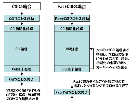 - FastCGIはCGIとして呼び出された際にApacheとは別プロセスとして起動し、処理が終了した後でも一定の期間処理を終了することなく、次のCGIへのアクセスを待ちます。アクセスがあった時に同じプロセスを使い回す事で、起動処理のオーバーヘッドが無くなり、レスポンスが上がります。